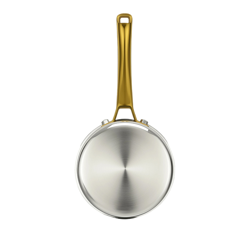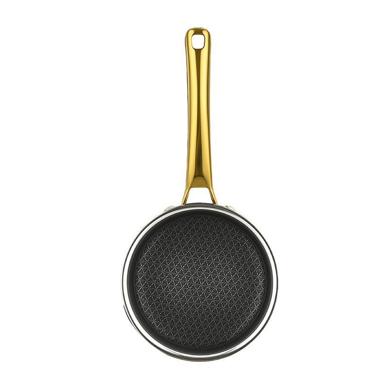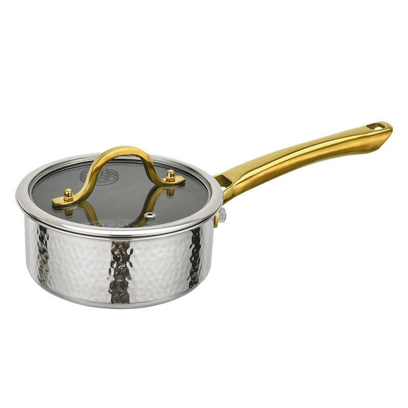 1. This is a high-end milk pan featuring hammered texture on the exterior, an etched honeycomb coating on the interior, and PVD-finished handle and lid knob. As another of our premium offerings that has gained popularity in major global markets, it delivers exceptional performance from every standpoint. We have achieved a meticulous balance in all aspects—from raw material selection and the treatment of internal/external surfaces to the craftsmanship of accessories. In short, regardless of which country or region you operate in as a business partner, this product is guaranteed to drive strong sales performance in your local market.