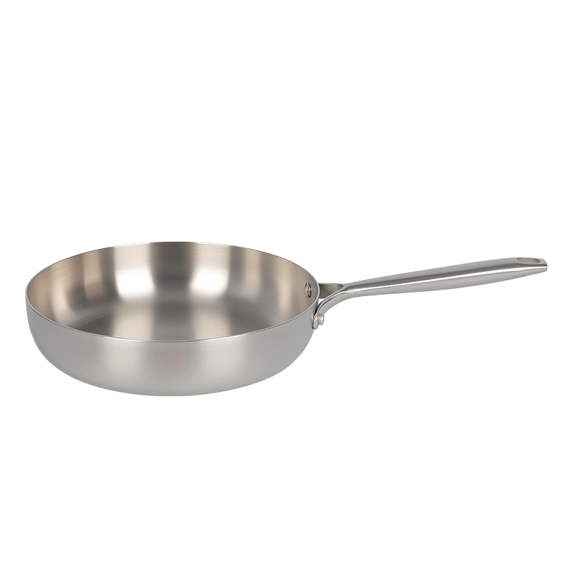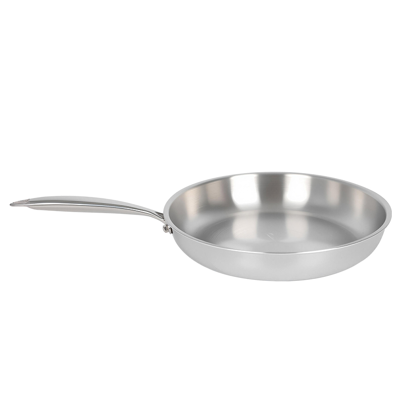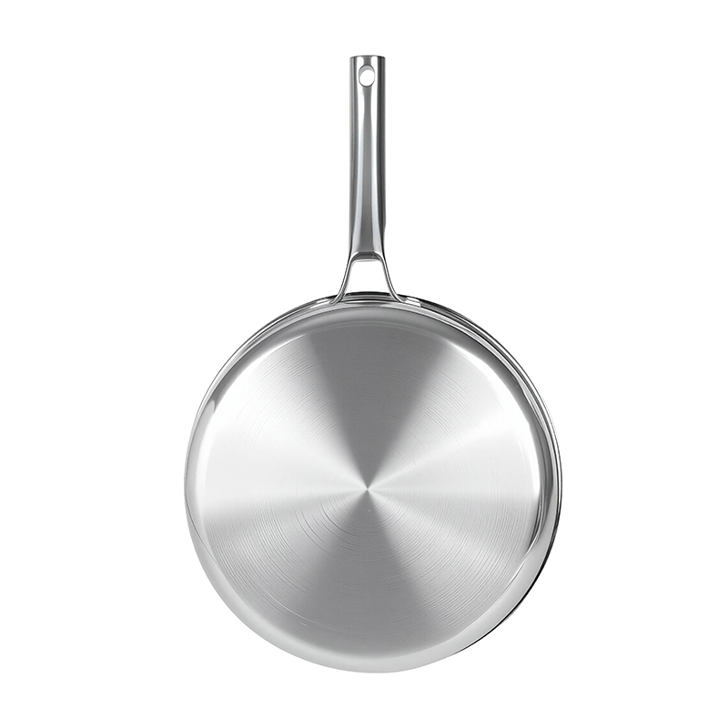 This frying pan features a polished finish on both its inner and outer surfaces. Crafted from food-grade 3-ply stainless steel construction, our product meets strict standards for safety, health, and non-toxicity—even without the need for any spray-on coatings.